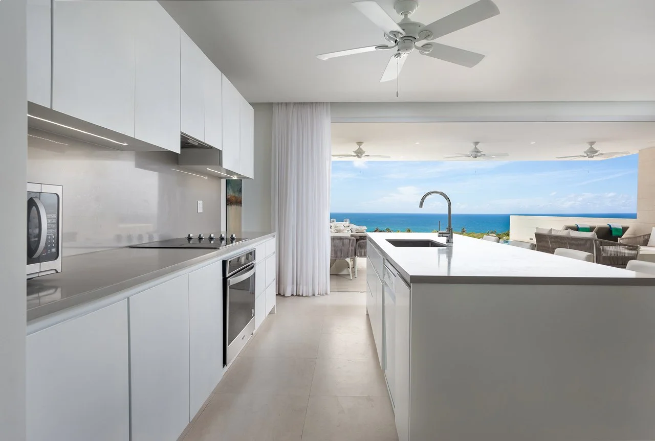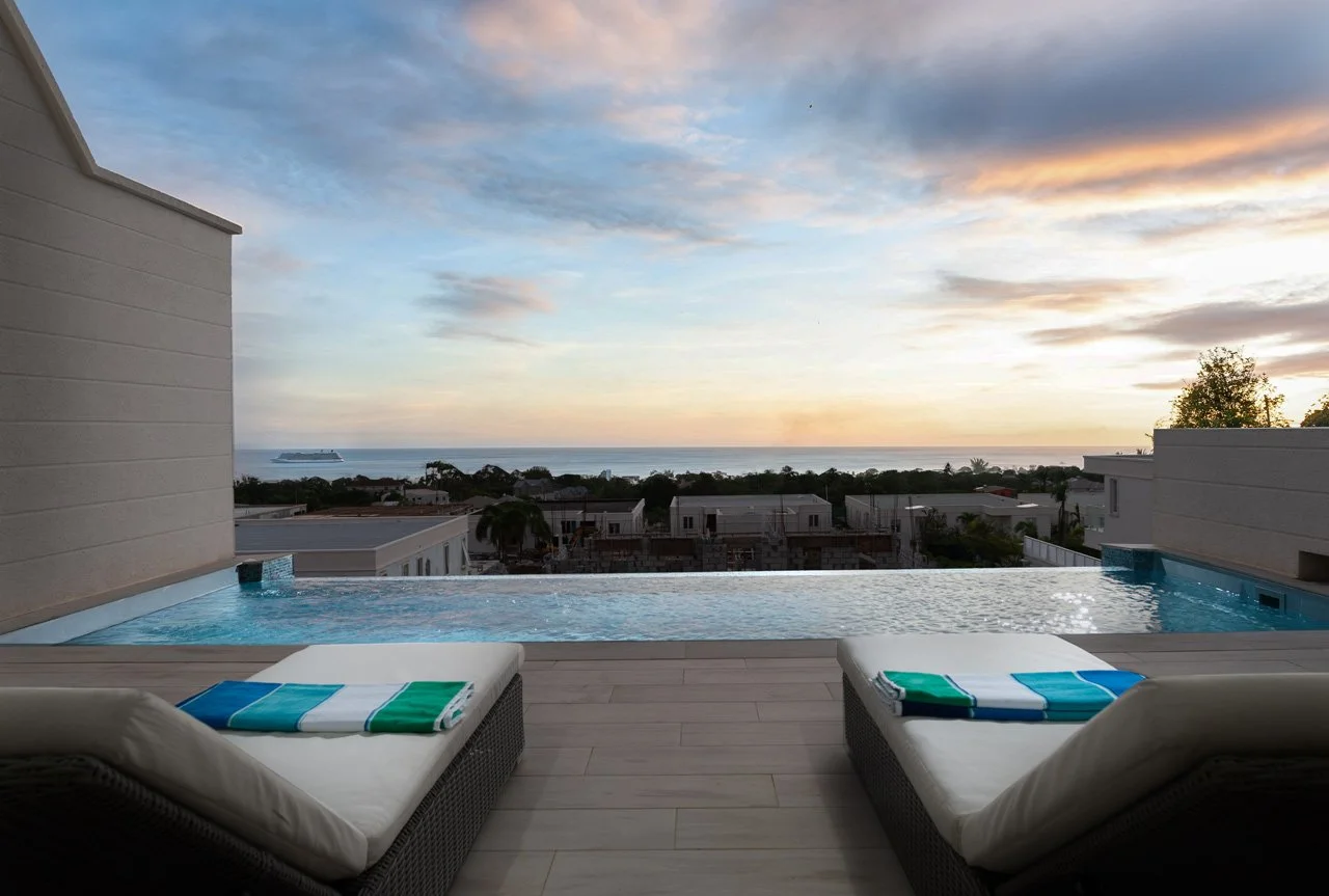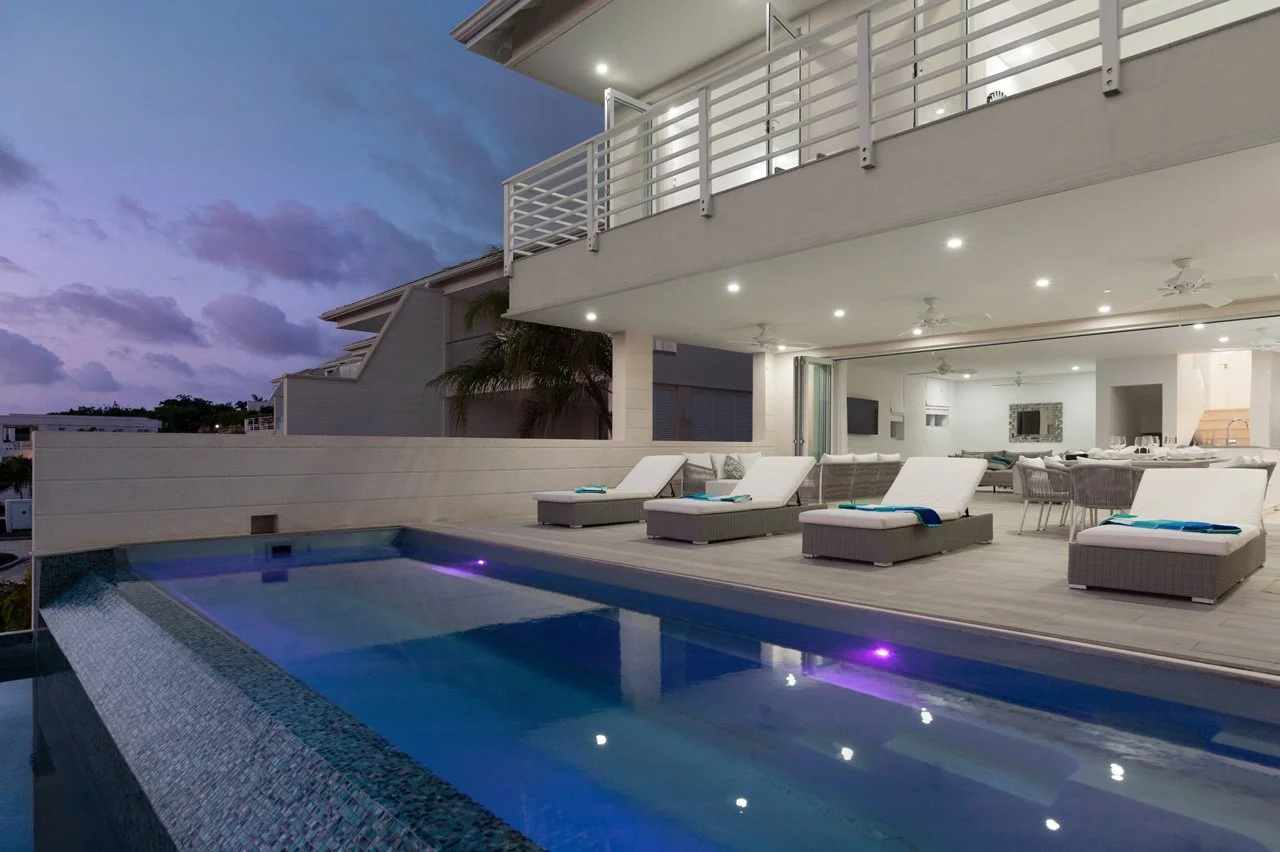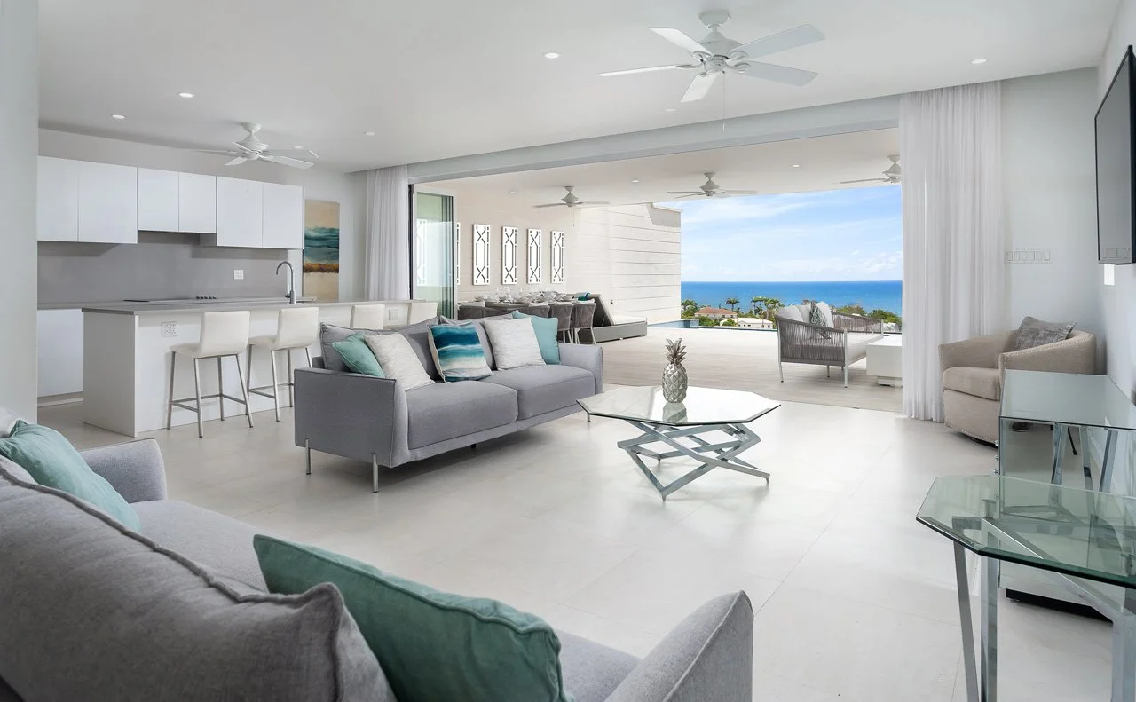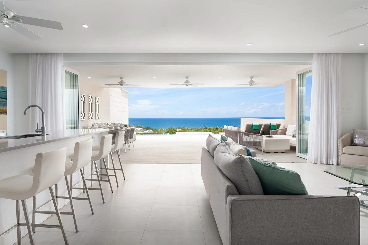 The villa boasts an expansive open-plan living area, complete with a flat-screen TV, a breakfast island, and a lounge area connected to the fully-equipped kitchen—ideal for gatherings with family and friends. The lower ground floor hosts the Cinema room, featuring a 75" screen and a high-quality sound system. French doors open wide to a terrace, extending the living space outdoors, where you'll find an outdoor dining area, lounge seating, sunbeds, and the 26ft infinity pool—a perfect spot to unwind with a rum punch and enjoy the stunning sunsets.