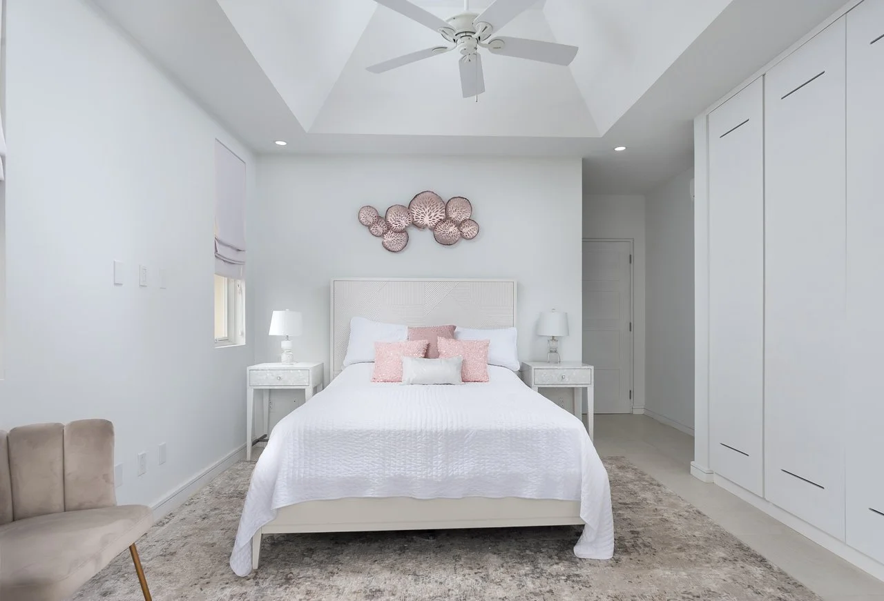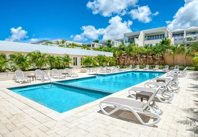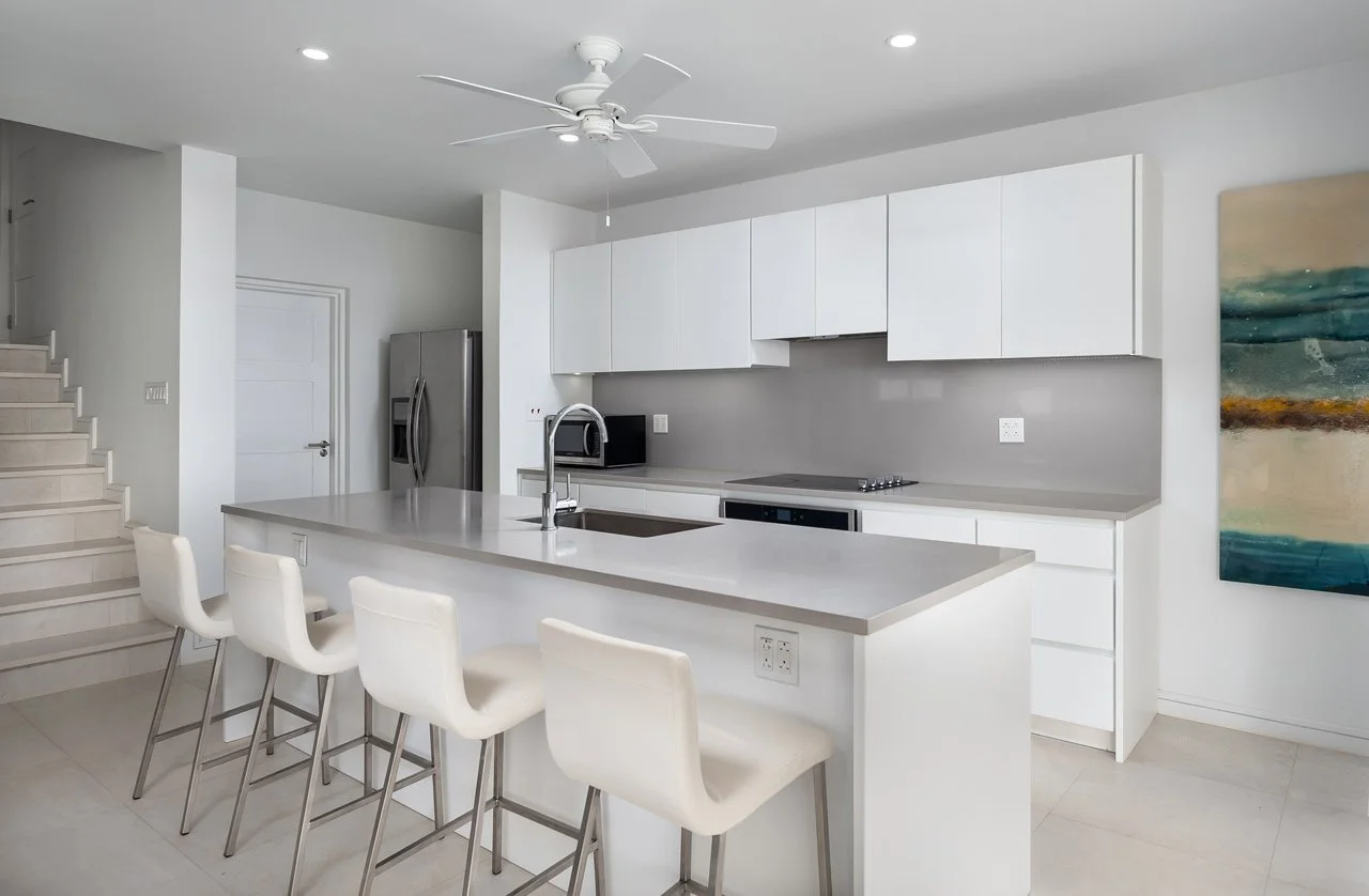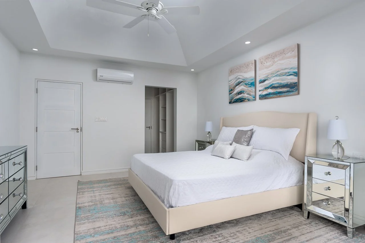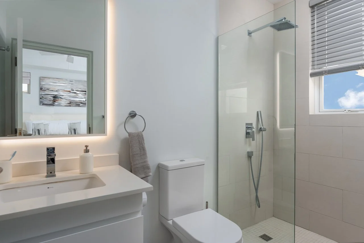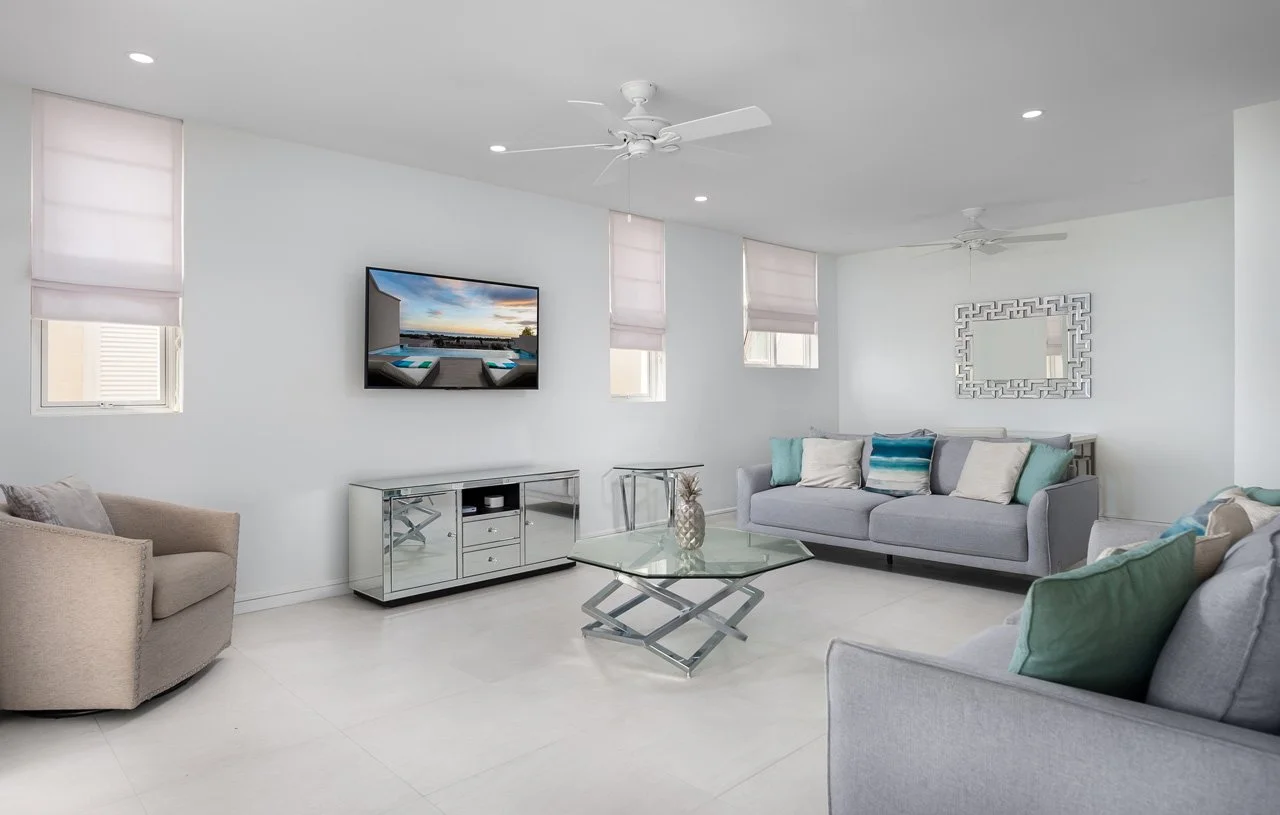 The villa boasts an expansive open-plan living area, complete with a flat-screen TV, a breakfast island, and a lounge area connected to the fully-equipped kitchen—ideal for gatherings with family and friends. The lower ground floor hosts the Cinema room, featuring a 75" screen and a high-quality sound system. French doors open wide to a terrace, extending the living space outdoors, where you'll find an outdoor dining area, lounge seating, sunbeds, and the 26ft infinity pool—a perfect spot to unwind with a rum punch and enjoy the stunning sunsets.