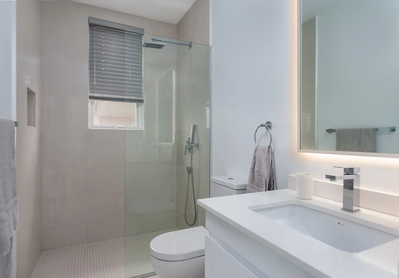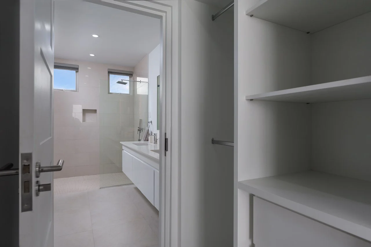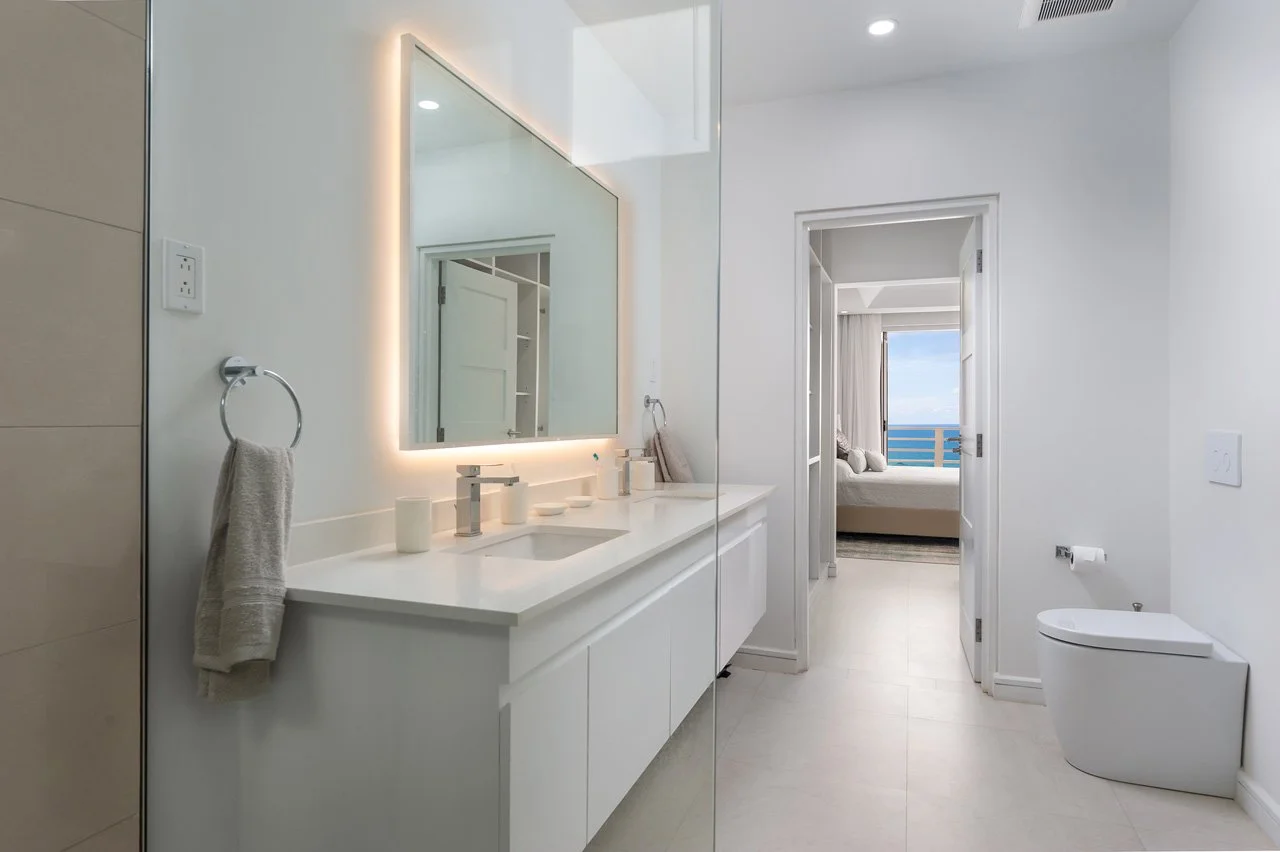 The master bedroom offers a king-size bed and an en-suite bathroom with his-and-hers vanities, plus a walk-through wardrobe. French doors lead to a balcony with sweeping sea views, which is also accessible from the second bedroom, featuring a queen-size bed and an en-suite bathroom.